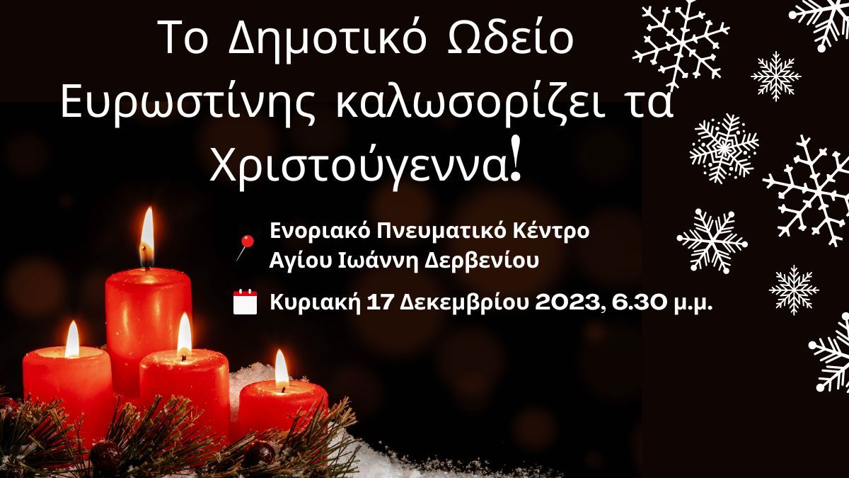 Το Δημοτικό Ωδείο Ευρωστίνης διοργανώνει χριστουγεννιάτικη γιορτή με μελωδίες, που θα μαγέψουν μικρούς και μεγάλους, καλώντας μας να παραστούμε, να τραγουδήσουμε, να χαρούμε μαζί! Η γιορτή αυτή θα λάβει χώρα την Κυριακή 17 Δεκεμβρίου 2023 και ώρα 6.30 μ.μ. στο Ενοριακό Πνευματικό Κέντρο Αγίου Ιωάννη Δερβενίου.